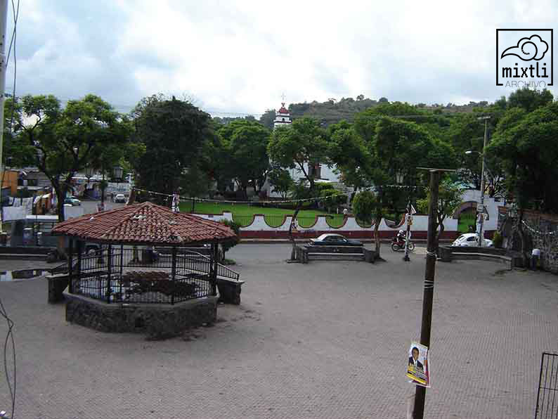 Vista del centro de San Lucas Xochimanca, se muestra el kiosko y la iglesia